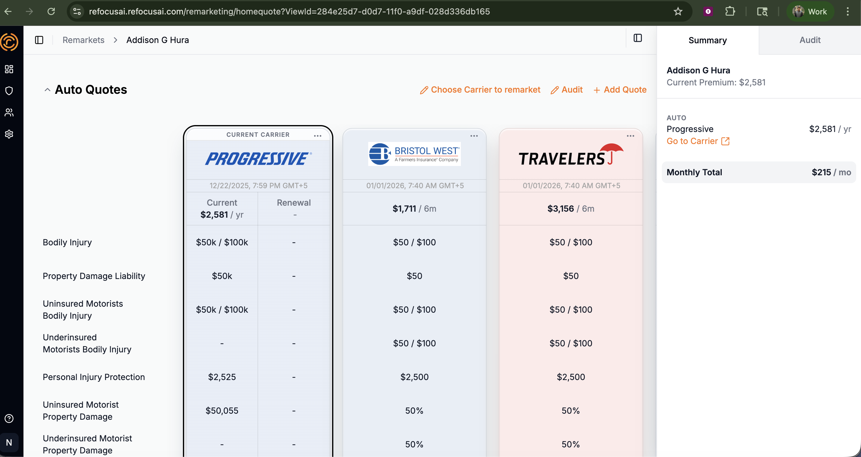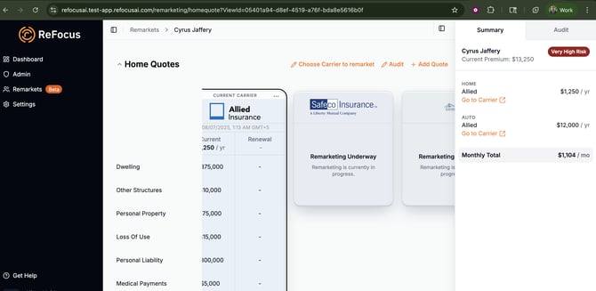 We have significantly improved how remarketing results are displayed. As soon as quotes start coming back from carriers, the remarketing details screen becomes available. Quotes appear one by one as they are received. Any quotes still in progress are clearly marked as “Remarketing Underway.” This gives you immediate visibility, rather than waiting for all quotes to complete.
