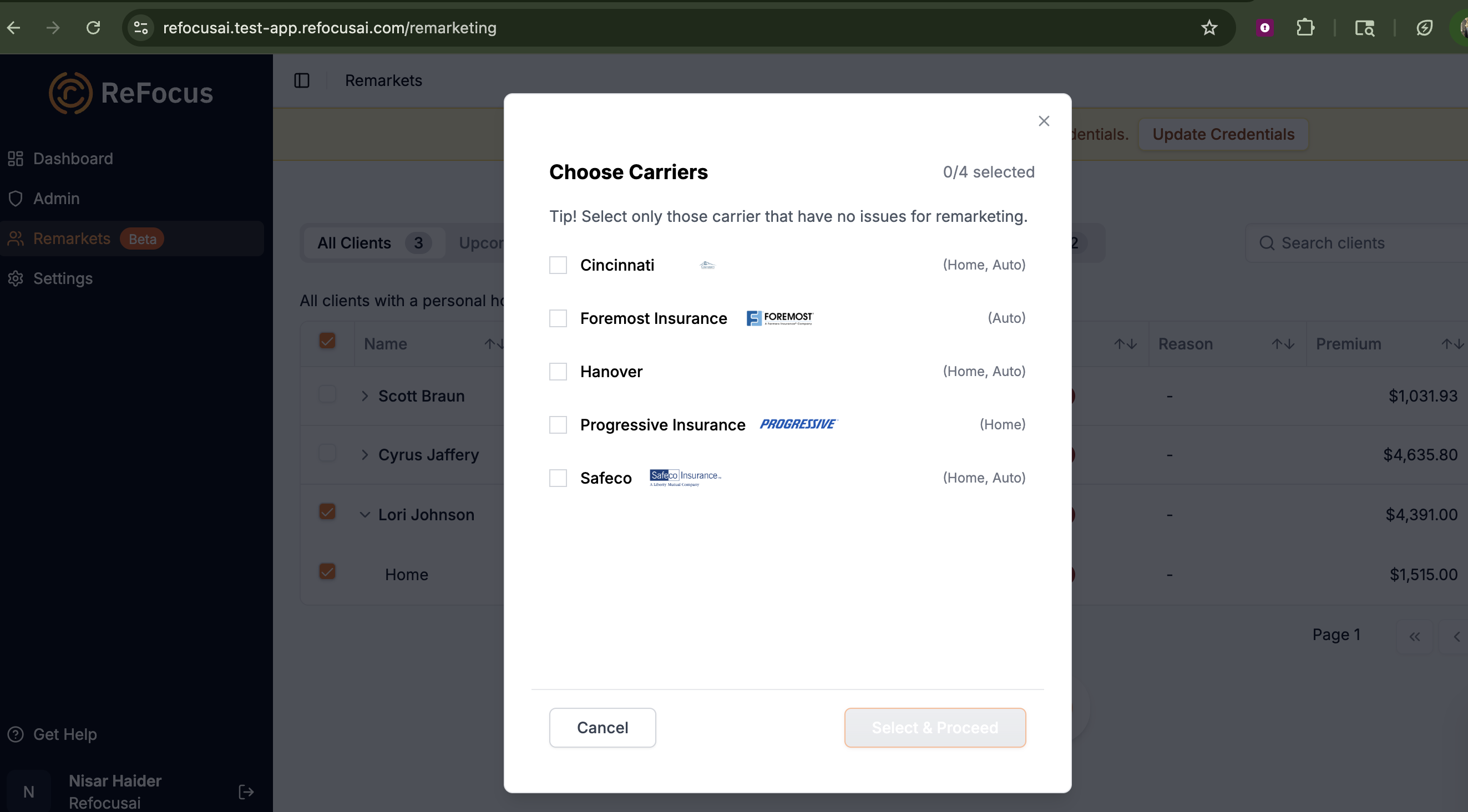 When remarketing begins, you will now see a carrier selection screen that lists the carriers available for the selected insured. You can select which carriers to include, up to the maximum limit configured for your agency. This gives you more control and transparency before remarketing starts.